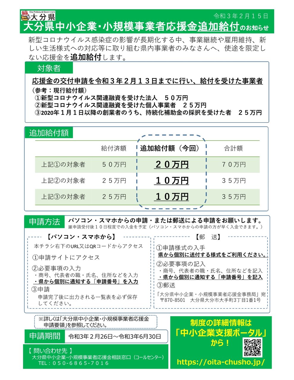 この大分県応援金ですが、なんと2回目の追加給付が決定。令和3年2月15日付で発表されております。