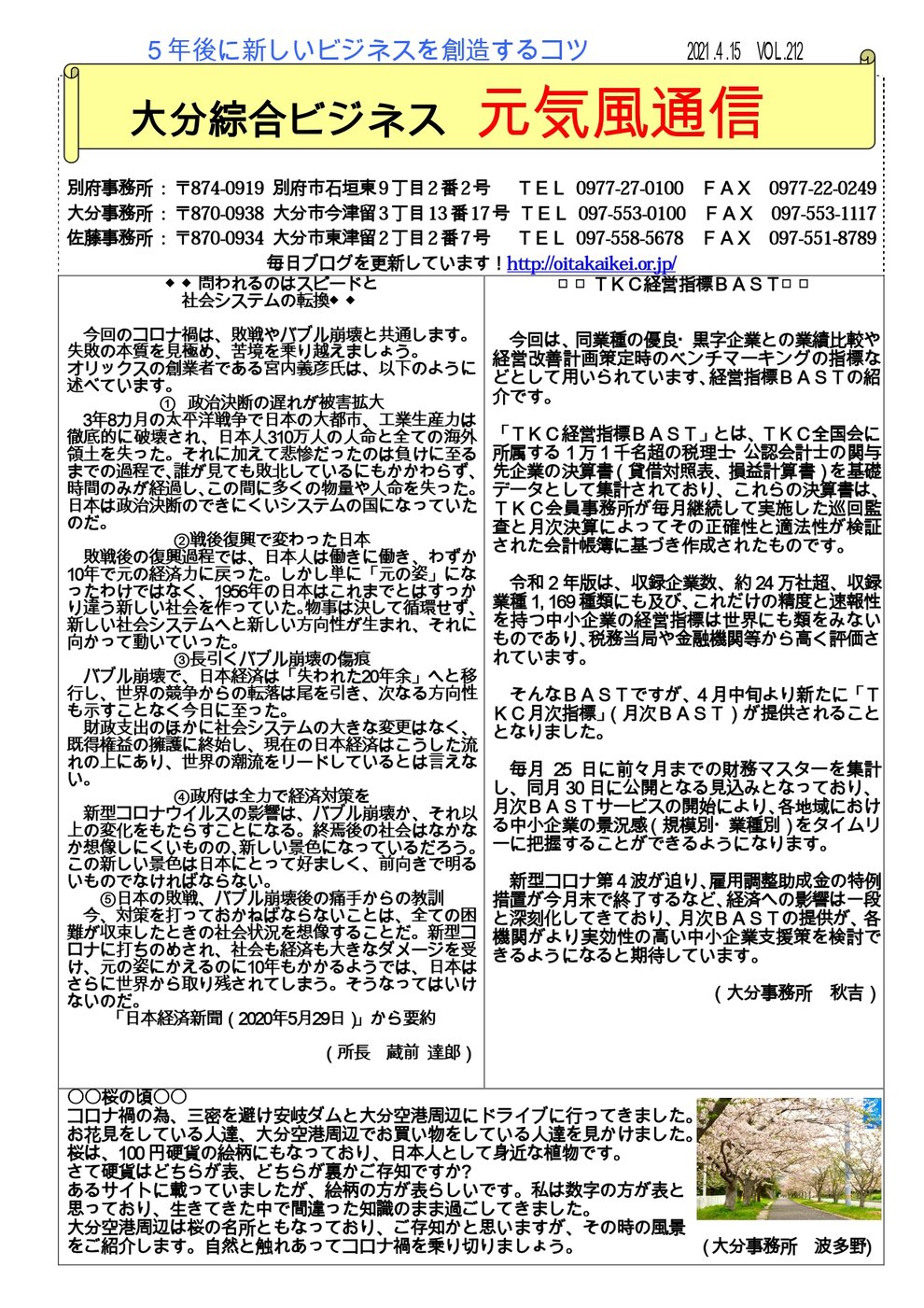 スタッフブログ · 2021/04/15 ★4月号 元気風通信★ 投稿者:広報委員 tagPlaceholderカテゴリ: 2020年, お知らせ, スタッフブログ, 大分事務所, TOPICS コメントをお書きください コメント: 0